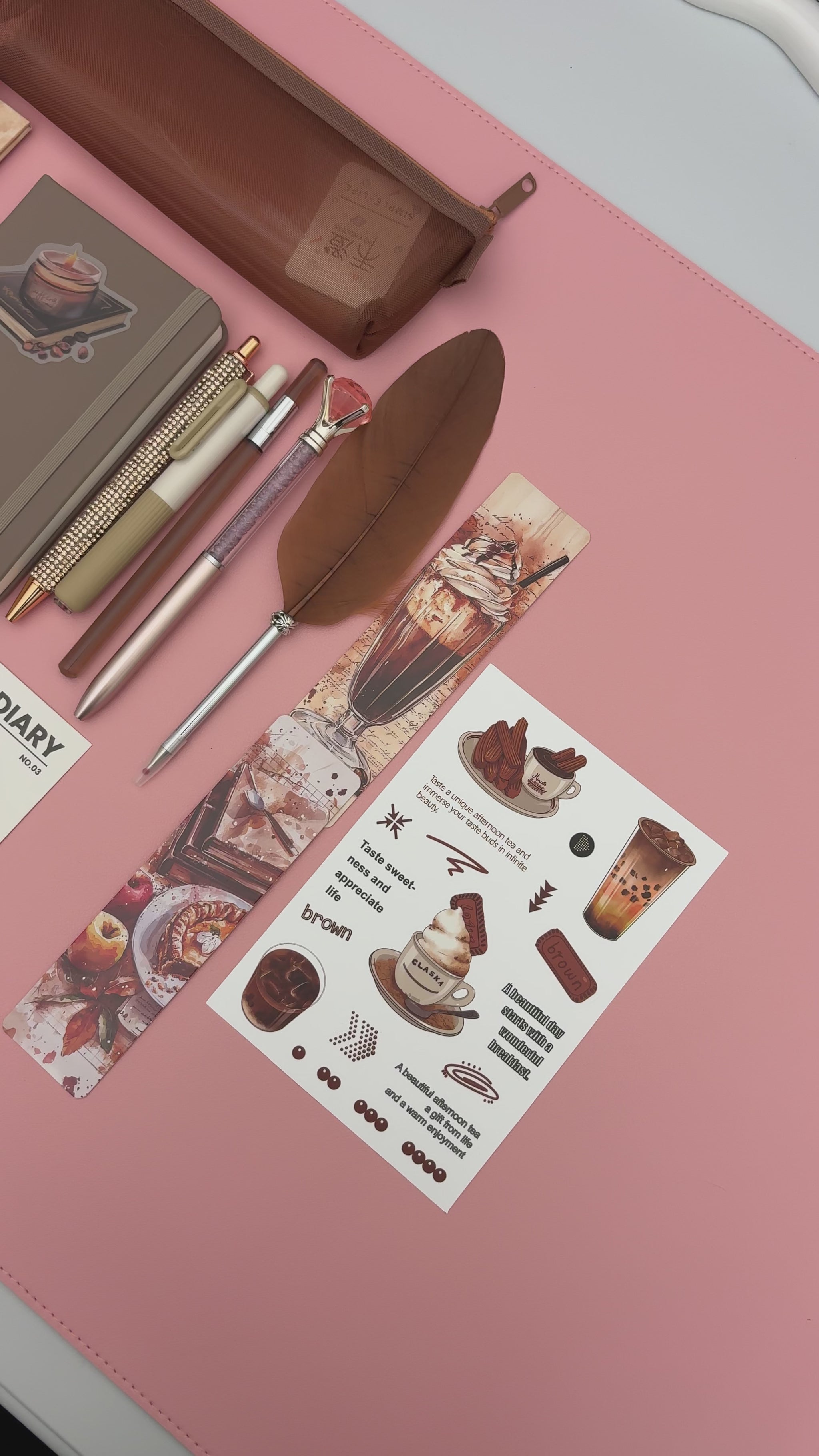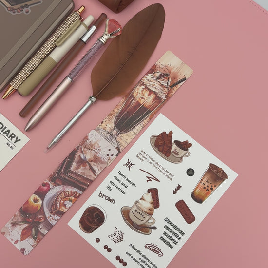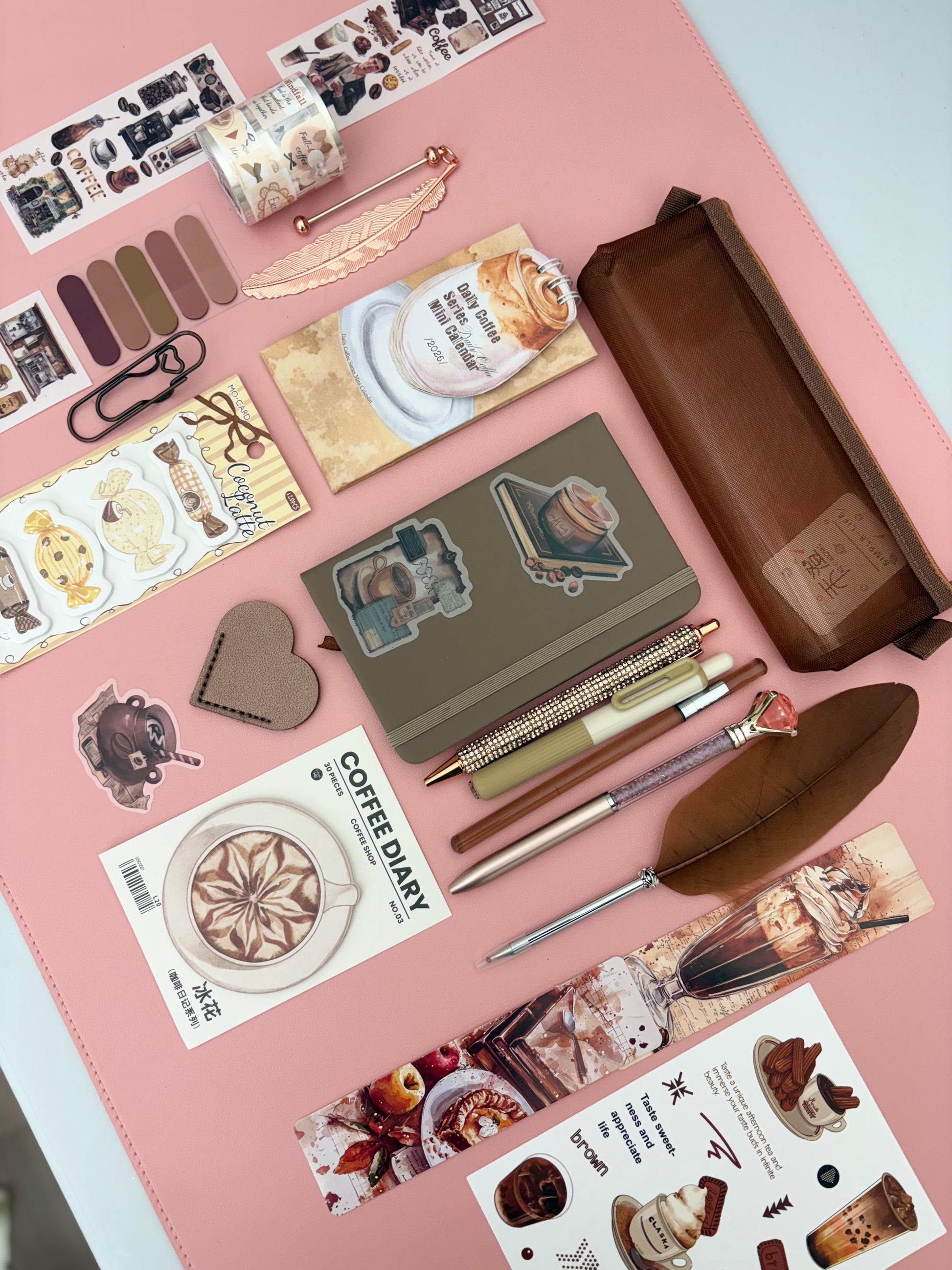 A warm coffee themed bookish bundle inspired by café vibes and neutral brown tones. Featuring a notebook, coffee planner, coordinating pens, feather pen, mesh pouch, stickers, sticky tabs, and aesthetic accessories.
