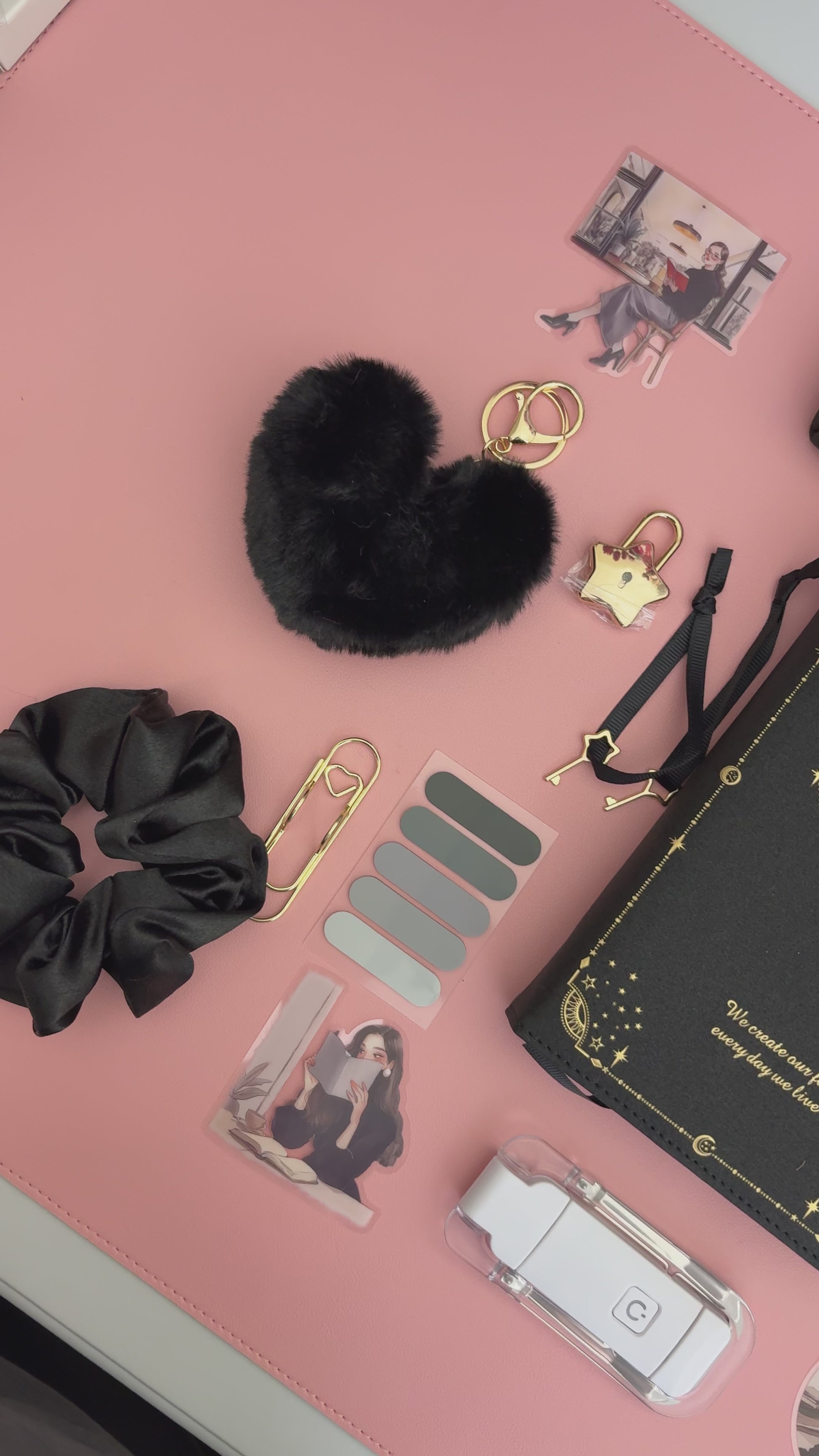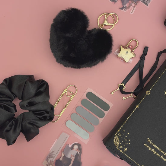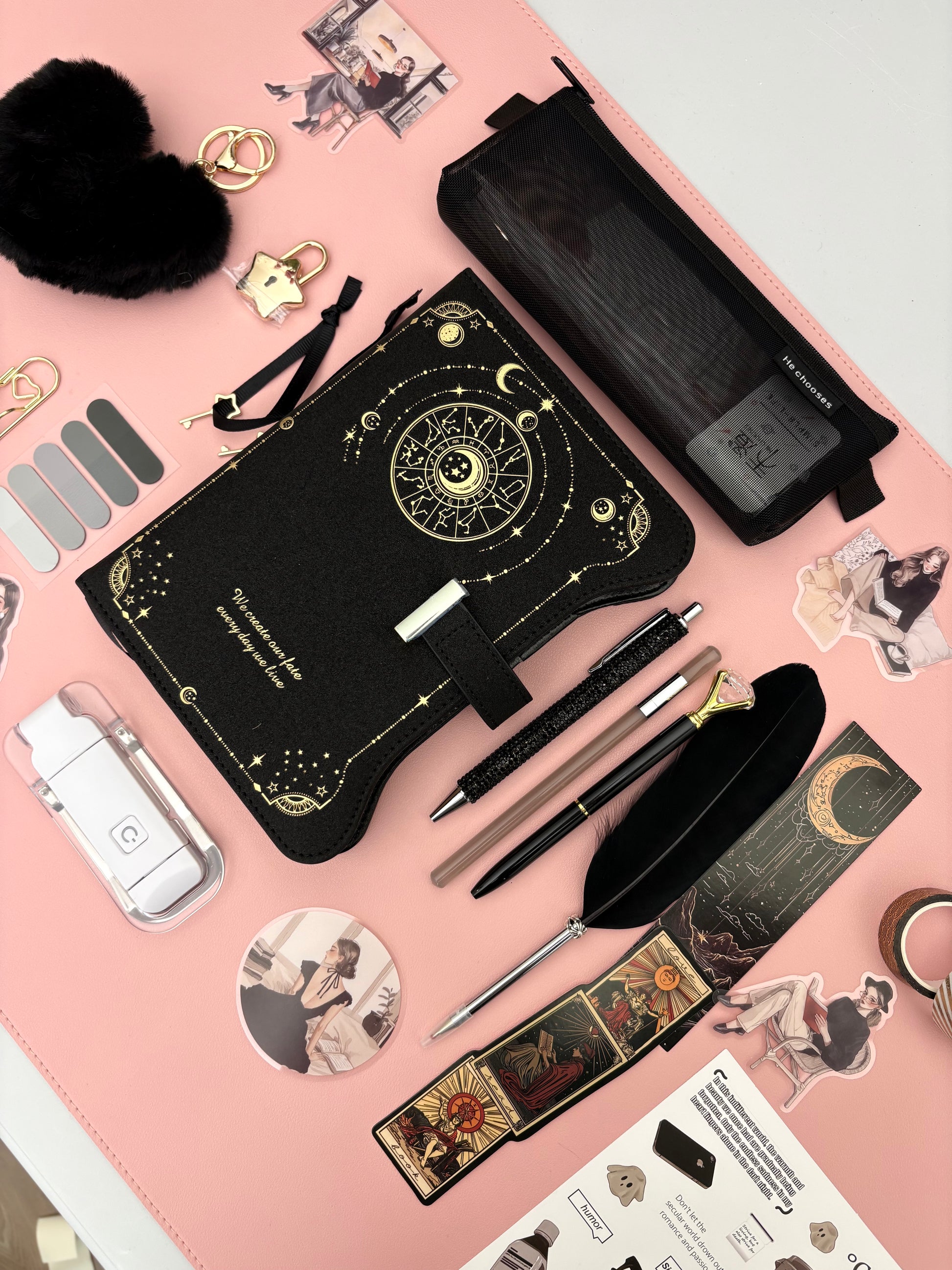 A dark, mystical bookish bundle inspired by celestial symbols and tarot aesthetics. Featuring a black zodiac notebook with gold detailing, coordinating pens, feather pen, mesh pouch, stickers, and themed accessories.